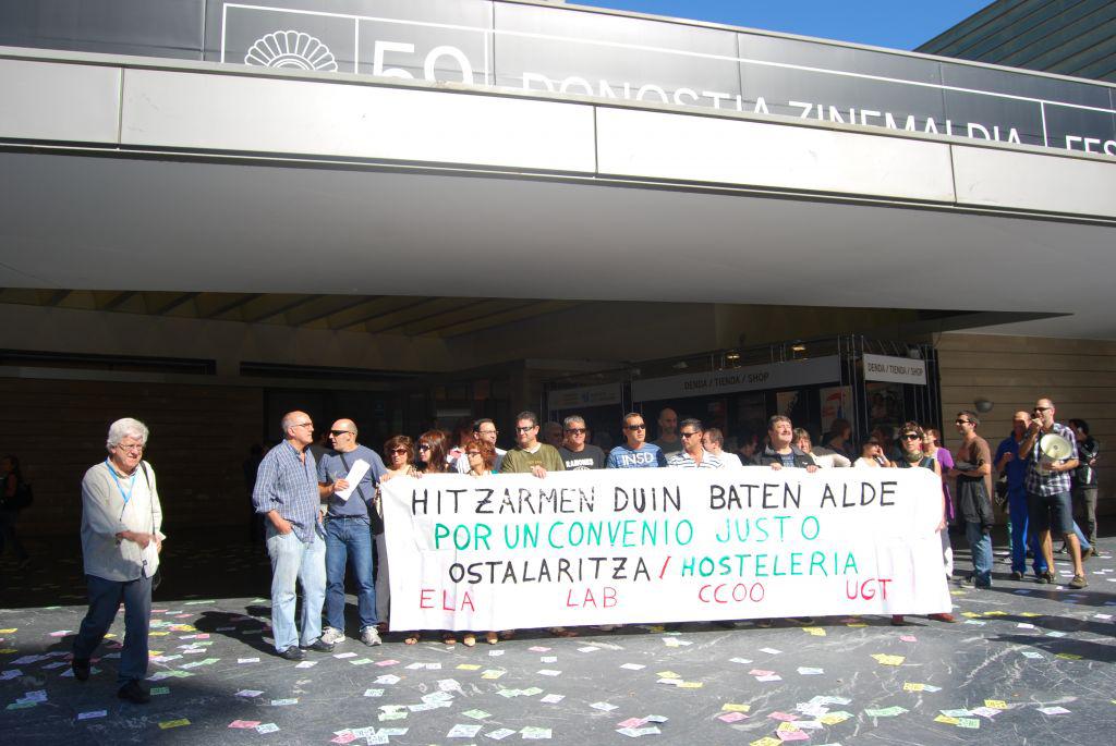 Zinemaldia dela-eta hiria jendez beteta dagoela baliatu nahi dute indarra egiteko. Testuinguru horretan, gaur goizean lan uztearen berri eman dute, jaialdiak hartuta dituen bi gune nagusietan: Kursaal eta Maria Cristina hotela. Eguerdiko filma ikusteko ilaran zain zeudenek bozgorailuak behin eta berriro errepikatzen zituen leloak entzun dituzte, langileen ordezkariek hitzarmen duinaren aldeko mezua zuen pankarta eusten zuten bitartean. Grebaren aldeko paperekin batera, euskaraz, gazteleraz, ingelesez eta frantsesez aldarrikapenak azaldu eta eragozpenenagatik barkamena eskatzen zuten orriak ere banatu dituzte.