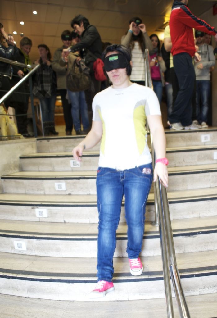 Easo Institutuko ikasleek begiak estalita eta kideen laguntzaz paseoan ibili dira ONCEren egoitzara egindako bisitan. (Argazkia: Mikel Goñi).