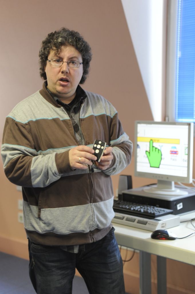 - Juanjo San Sebastian errehabilitazio teknikariak irakurketarako tresna laguntzaileak erakutsi dizkie bisitariei. (Argazkia: Mikel Goñi)