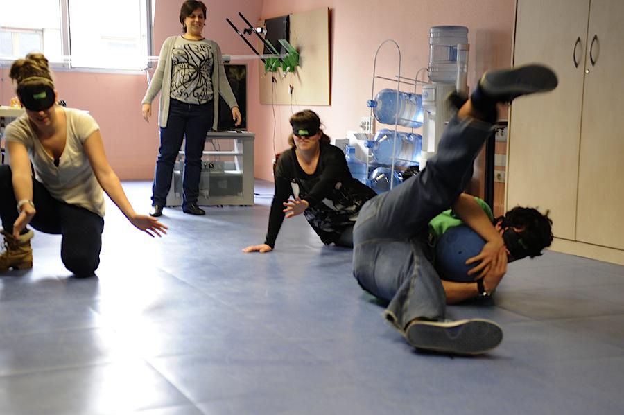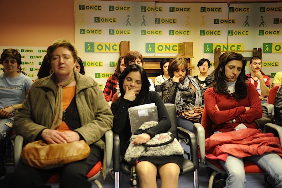- Itsuek zineman duten esperientzia sentitzeko begiak itxita ikusi dute film baten tartetxoa. (Argazkia: Mikel Goñi)