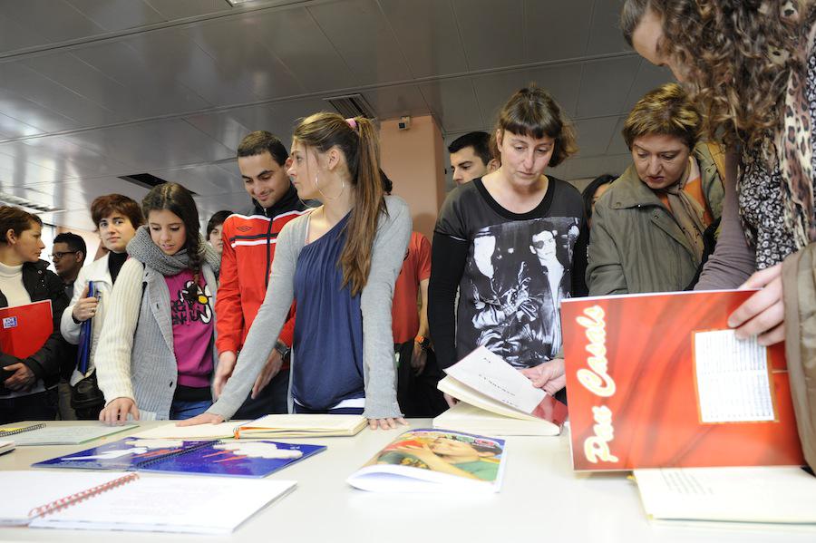 - Ikusmen zailtasunak dituzten haurren liburu egokituak ere ikusi dituzte Easo Institutuko ikasleek. (Argazkia: Mikel Goñi)