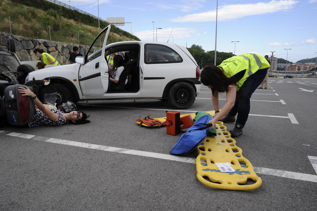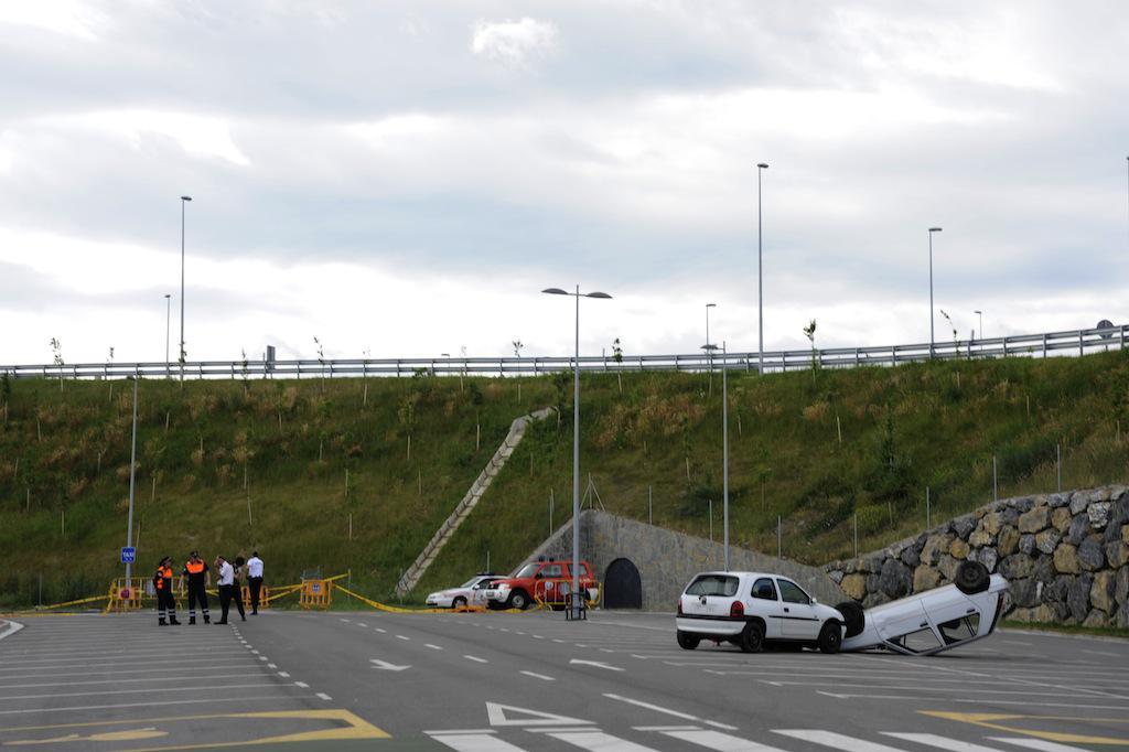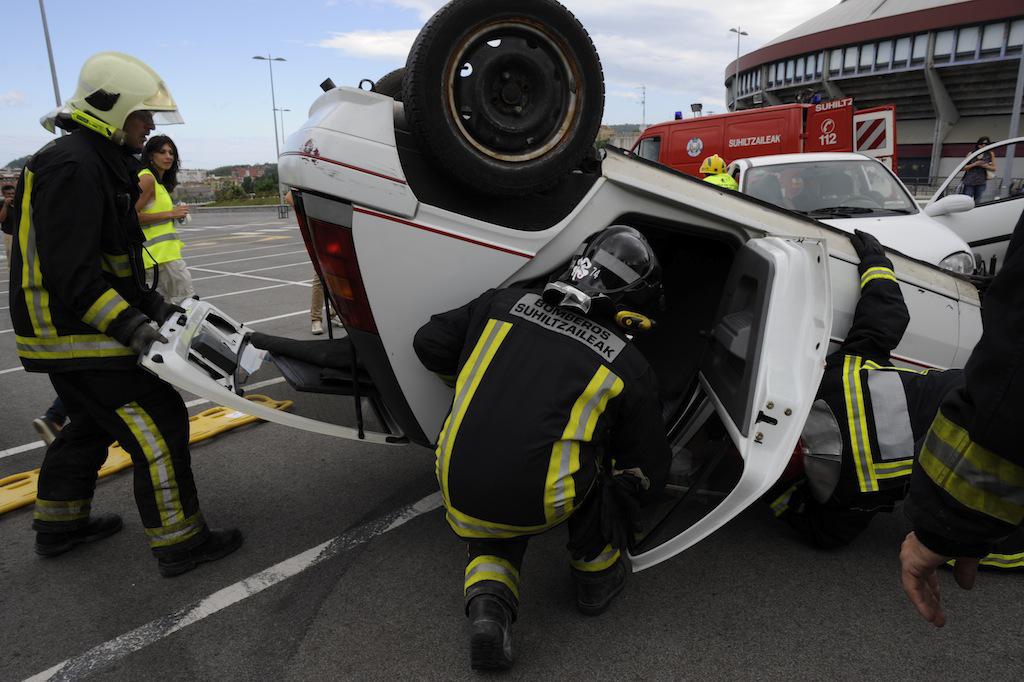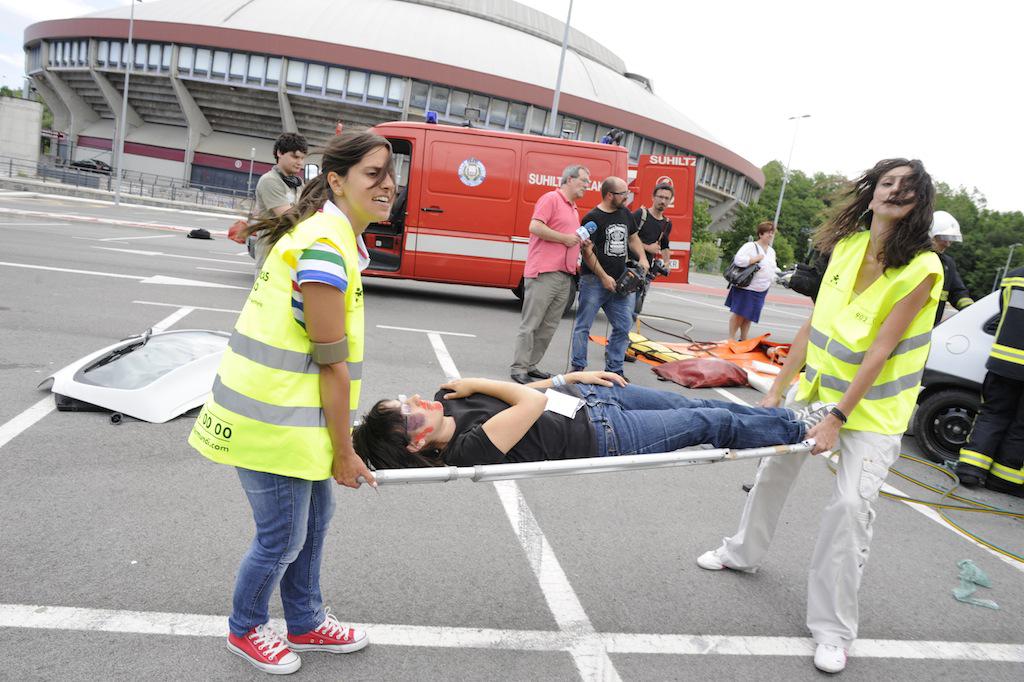 Benetako hiru ibilgailuren arteko istripuaren itxurak egin dituzte, eta larrialdi handi baten moduan jokatu dute. Suhiltzaileek, esaterako, talka egindako kotxeetako baten sabaia moztu egin dute. Anbulantziak ere gora eta behera ibili dira.