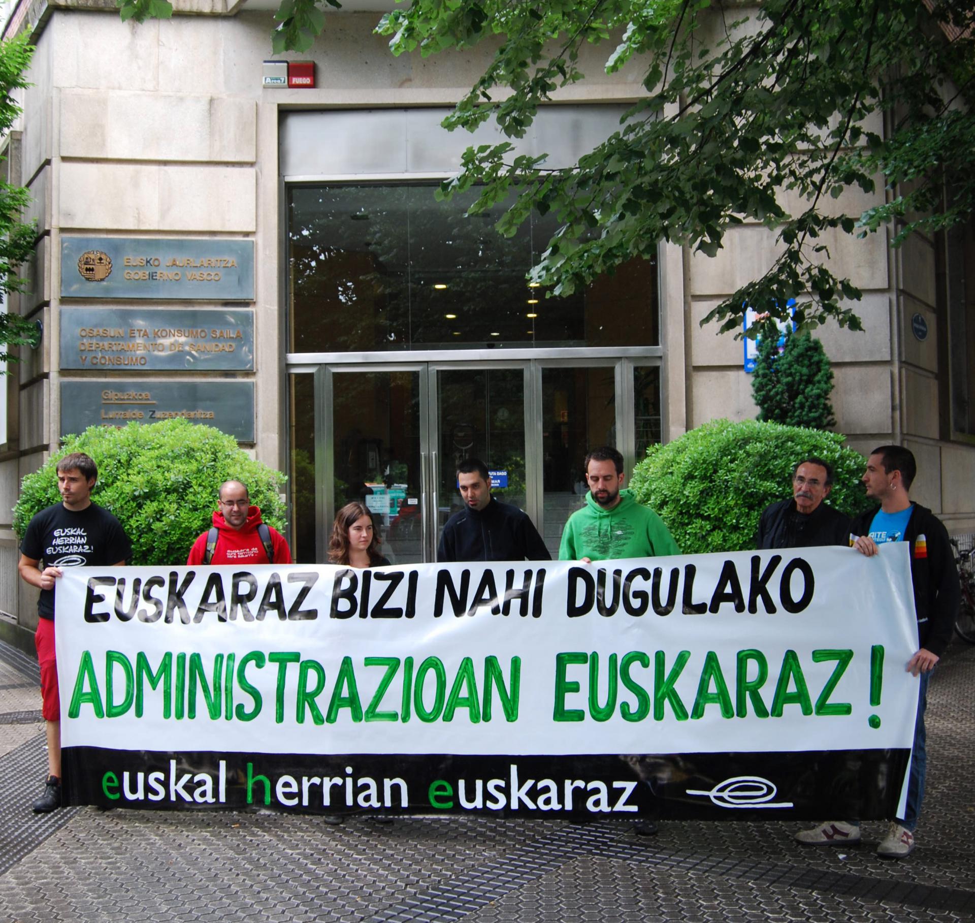 Euskal Herrian Euskaraz mugimenduko kideek elkarretaratzea egin zuten, atzo, Hezkuntzako eta Osakidetzako azken lan deialdi publikoetan euskara postu guztietarako derrigorrezkoa ez dela salatzeko. Antso Jakituna kaleko Eusko Jaurlaritzaren Gipuzkoako Osasun eta Kontsumoko Lurralde Zuzendaritzaren aurrean,