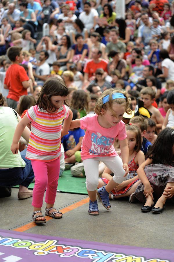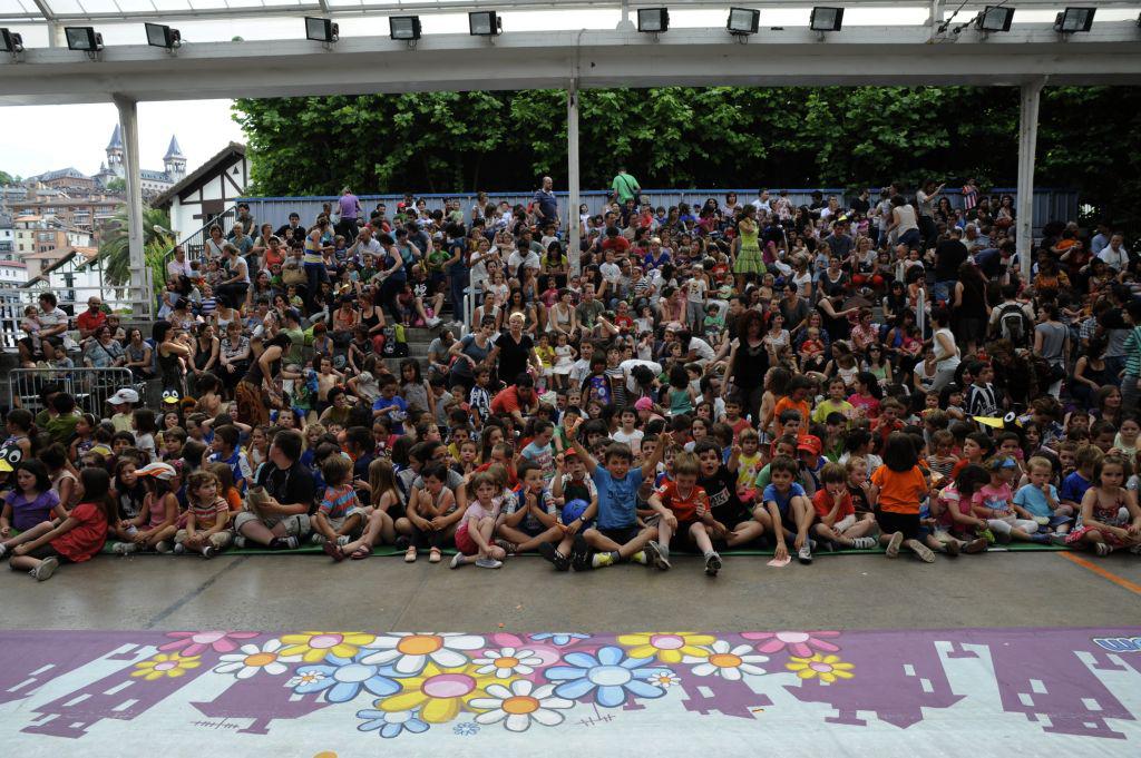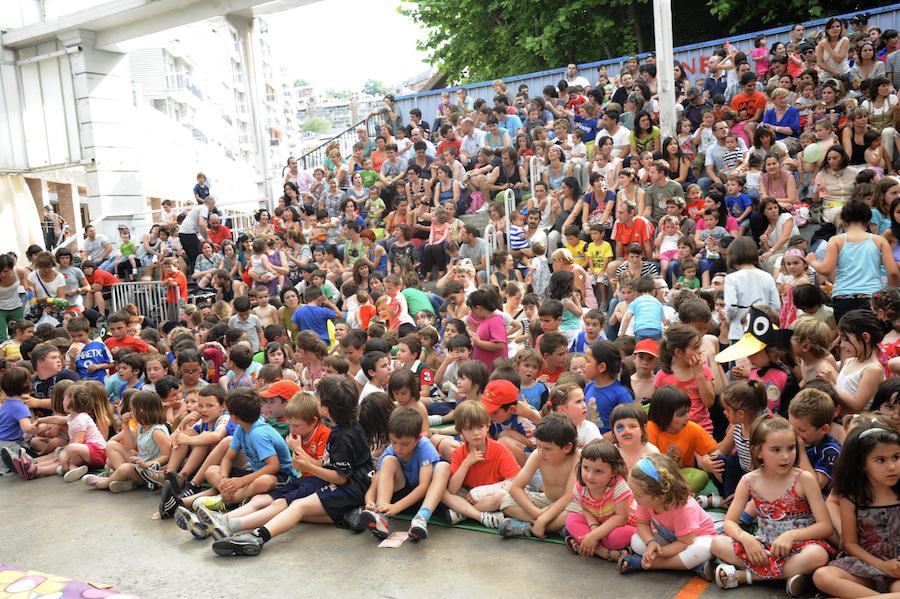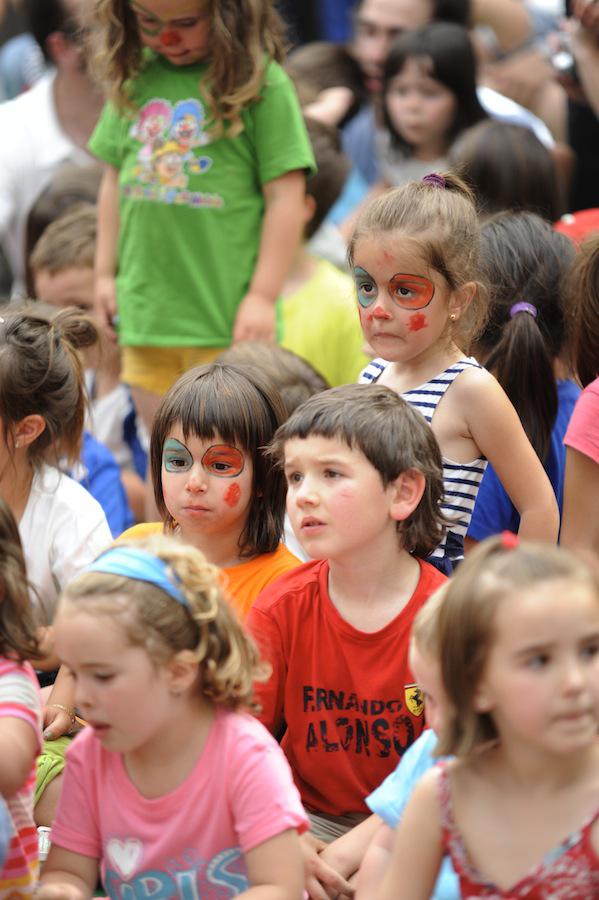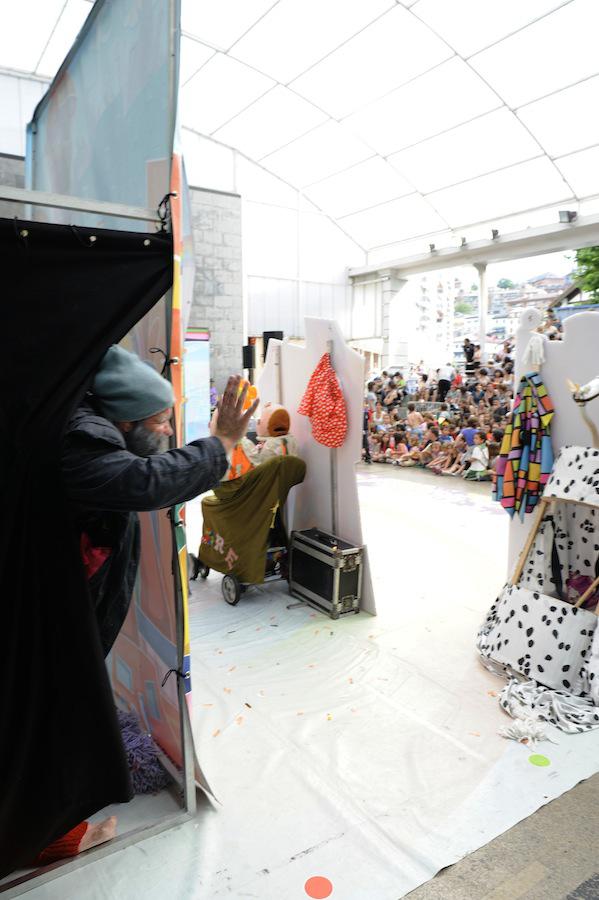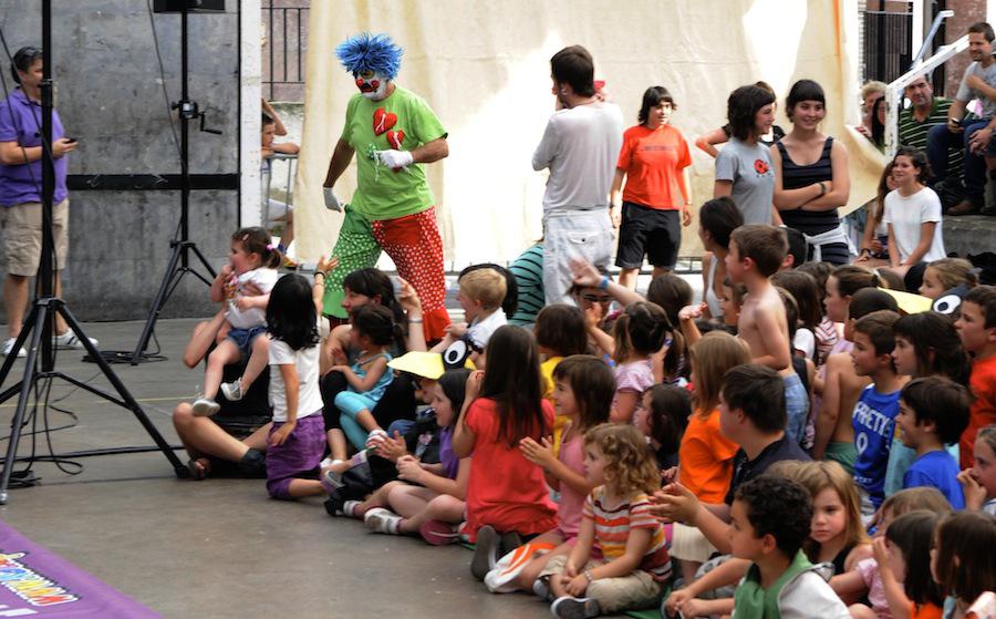 Pailazoak atzeko partetik azaldu direnean irribarreak haurren aurpegietara itzuli dira. Txaloek eta algarek ongietorria eman diete umeen pailazo kuttunei, eta Zazpikoloroa ikuskizunak pozez bete du Antiguako pilotalekua.