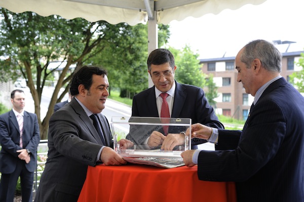 Ernesto Gasco Eusko Jaurlaritzako Garraio sailburu ordea, Patxi Lopez lehendakaria eta Iñaki Arriola Herri Lan eta Garraio sailburua lehen harria jartzeko ekitaldian erabilitako bete zuten kutxa egunkariz eta dokumentuz. (Argazkia: Mikel Goñi)