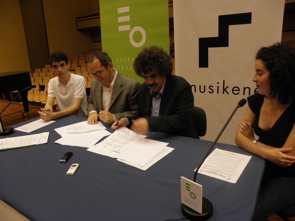 Cristina Fragaren hatzek jarri zioten musika Euskadiko Orkestra Sinfonikoaren egoitzari, atzo goizeko aurkezpenean. Musikeneko ikaslea da Fraga, eta Robert Schumann musikagile alemaniarraren pieza bat eskaini zuen pianoan. «Egun berezia denez, modu berezian hasi nahi izan dugu», azaldu zuen Iñigo Alberdik, orkestrako zuzendari nagusiak. Patricio Goialde, Musikeneko kudeatzaile akademikoa, eta Musikeneko beste bi ikasle ere izan zituen ondoan Alberdik. Izan ere, Euskadiko Orkestra Sinfonikoak eta Musikenek hitzarmen garrantzitsu bat sinatu zuten atzo bertan. Hitzarmenaren helburu nagusia, bi erakundeek indarrak batzea da, eta ikasleek esperientzia profesionala zuzenean bizitzea. Hitzarmenari esker, Musikeneko ikasleek orkestrarekin denboraldiko kontzerturen batean joko dute, besteak beste. Jorda Gela izeneko programa osatu dute hitzarmenaren bidez; eta datorren ikasturtean abiatuko da. Momentuz, lau urteko balioa izango du, baina luzatzeko asmoa dute.