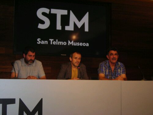 Ezkerretik eskuinera, Telmo Esnal zinemagilea, Lander Garro idazlea, eta Joxe Mari Agirretxe aktorea.
