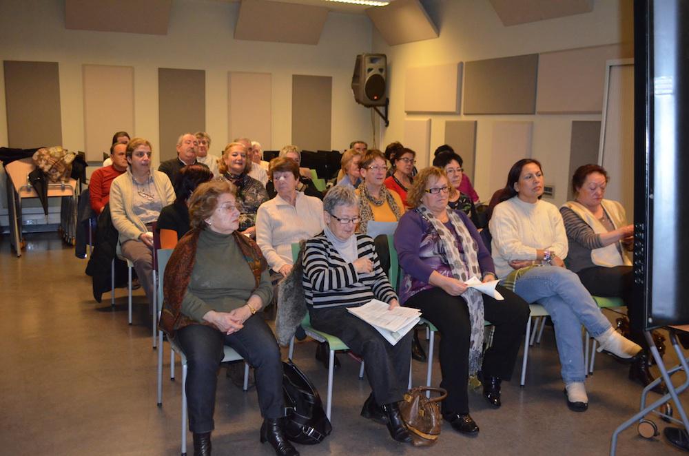 Hogeita hamar bat gizon eta emakume elkartu dira gaur Musika eta Dantza Eskolan. Eguraldi txarretik ihesi, gustura egon dira garai bateko abestiak entzun, gogoratu eta abestuz.