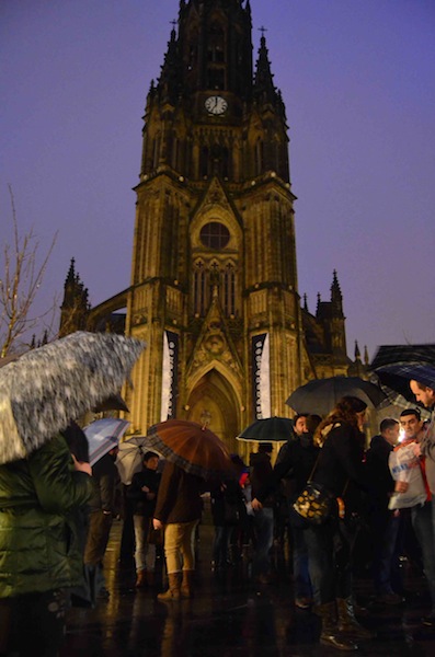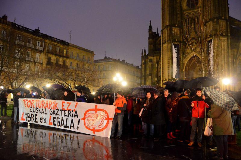Jende andana bildu da Artzain Onaren elizaren aurrean,Torturarik ez. Euskal gazteria libre eta legala leloarekin. Ertzaintza inguruan izan da, baina normaltasunez egin dute protesta, Donostiako hamabost gazte auzipetuen aldeko oihuen artean.