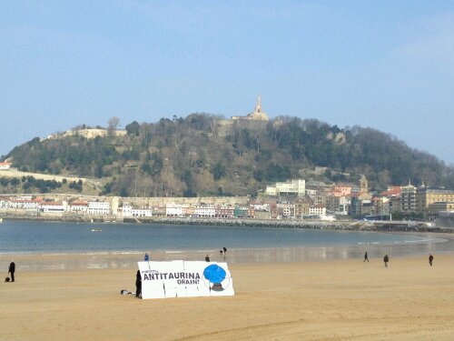 Kontxako hondartzan hasi dute gaur zezenketen aurkako kanpaina. Hainbat lagun elkartu dira Askekintza Animalista elkarteak deitutako protestan. Mosaiko bat osatu dute denen artean, eta
