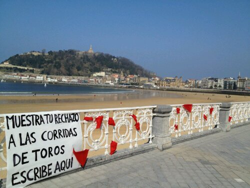 Donostia antitaurina orain! leloa osatu dute. Gainera, zapi gorriak banatu dituzte herritarren artean, bertan zezenketen aurkako mezu bat idatzi eta Kontxako barandan lotzeko.
