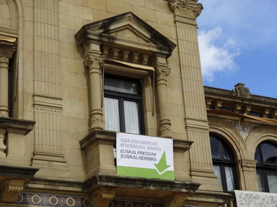 Giza eskubideak, irtenbidea bakea. Euskal Presoak Euskal Herrira dioen kartel bat dago jarrita udaletxeko alkatetzako balkoian, eta PSE-EE alderdiari ez zaio ondo iruditzen. Donostiako sozialisten bozeramaile Ernesto Gascoren arabera, “ez da bidezkoa eraikin publikoak aldarrikapen politikoak dituzten mezuak erakusteko erabiltzea, eta Juan Karlos Izagirre, Donostiako alkateak, gainerako taldeen onarpenik gabe hartzen ditu horrelako erabakiak”.