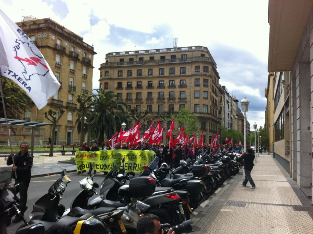 Azkenik, Okendo kaleko enpleguaren bulegoan “lan harremanetarako euskal esparrua” zihoen pankarta zabaldu dute. Manifestazioa Alderdi Ederren amaitu da, adierazpenak egiteko prest.