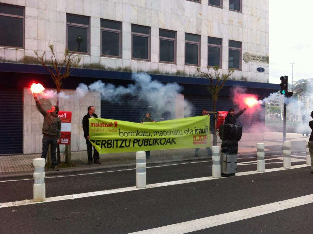 Lehen oihuak “hemen lan egin, bertan erabaki” izan dira. Baina, noski, grebaren aldekoak, hitzarmenen aldekoak edota banketxeen aurkakoak ere entzun ahal izan dira. Manifestazioaren hiru puntutan ekintzak egin dituzte. Lehena Eusko Jaurlaritzaren delegaritzaren aurrean egin dute, zerbitzu publikoen defentsan. Ondoren, Getaria kaleko Kutxaren bulegoaren aurrean “euskal sistema finantzieroa” aldarrikatu dute.