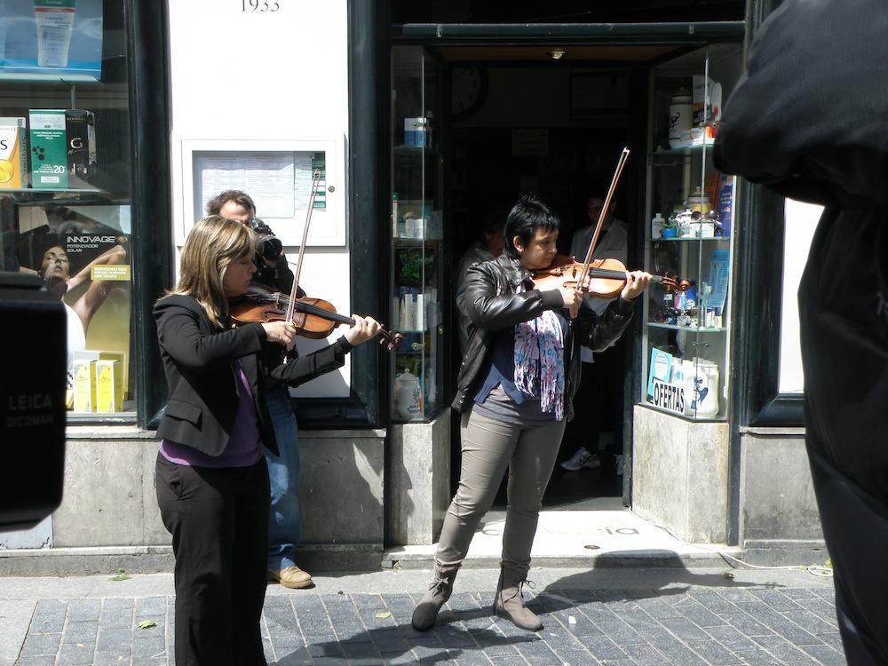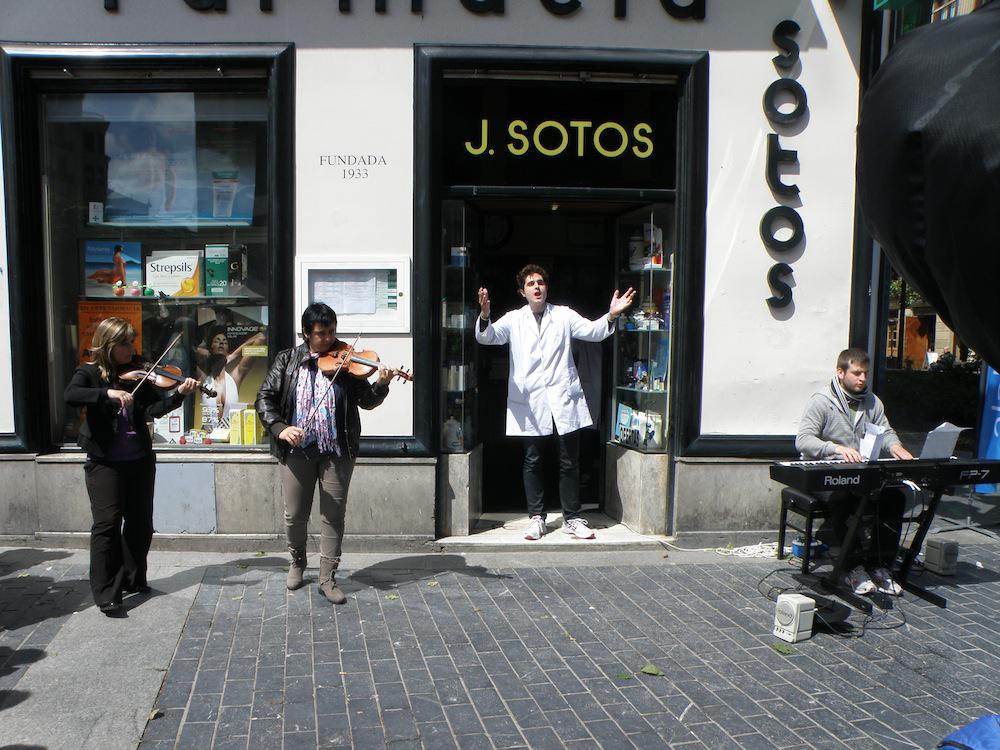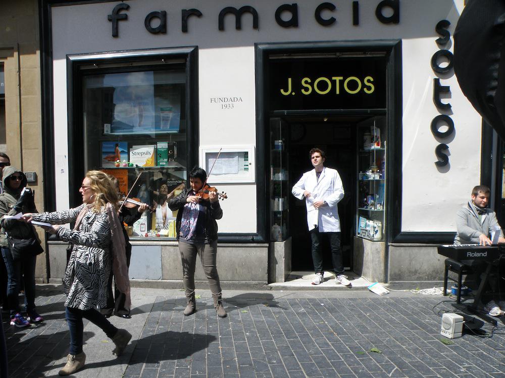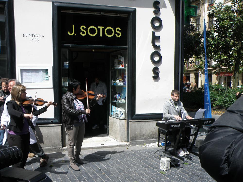 Pianista jotzen ari zen alboan, farmazia bat dago eta bertatik gizon bat irten da bata zuri eta guzti eta kantuan hasi da, bertaratutakoak harrituz. Ondoren emakume bat batu zaio eta jendearen artean zeuden hainbat. Horien artean, udaltzaingoz jantzita zeude bi lagun ere.