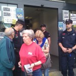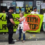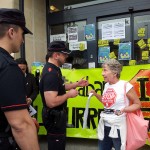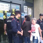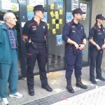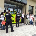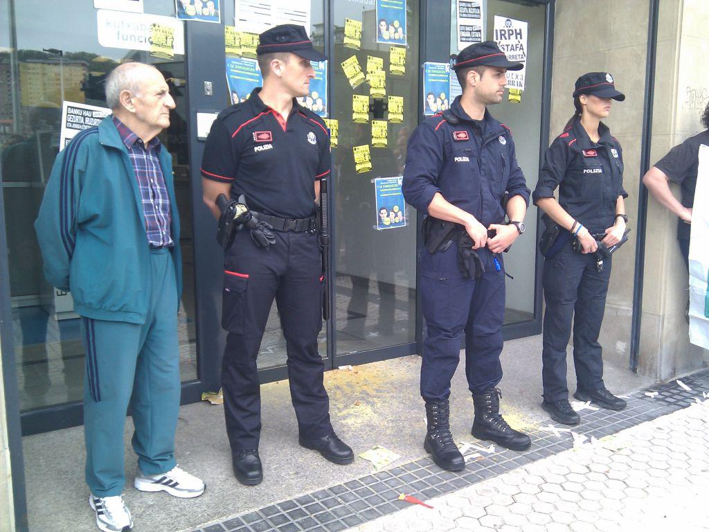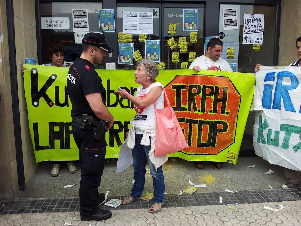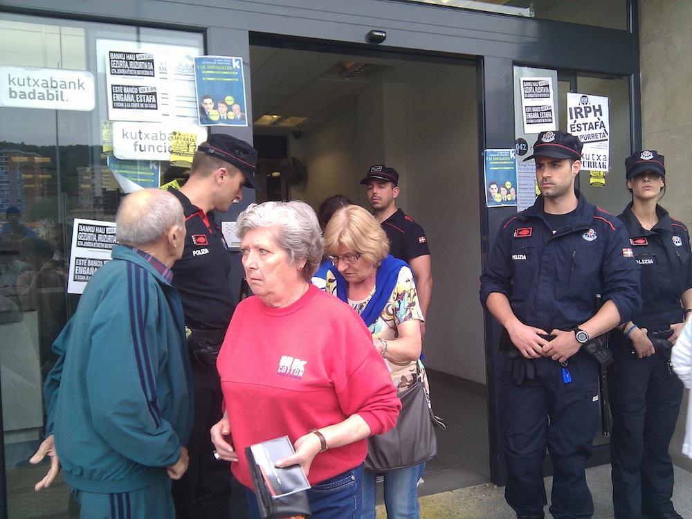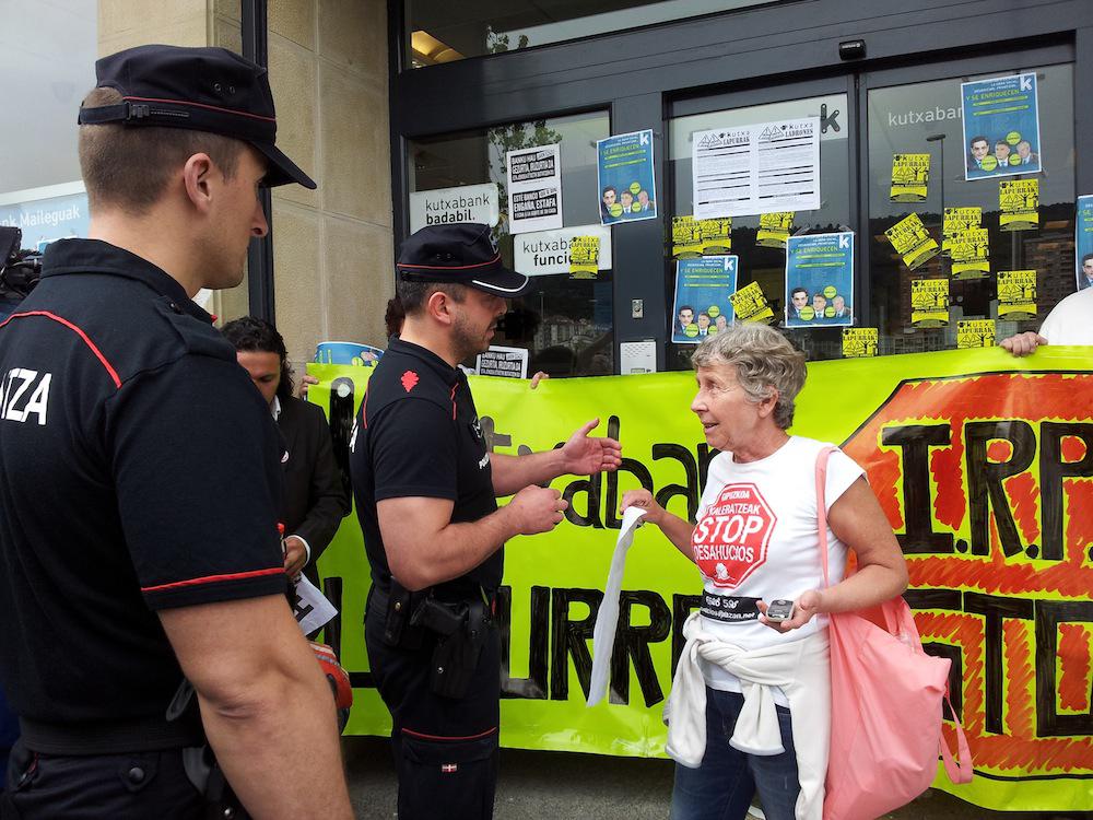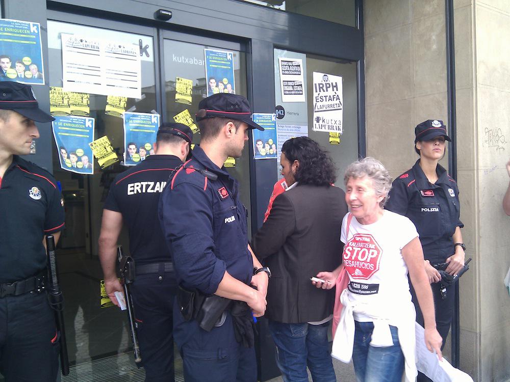 Protesta hasi eta ordu laurdenera, Ertzaintza joan da bulegora. Stop Kaleratzeak plataformako kideei ataritik aldentzeko eskatu die. Bulegoko sarrera oztopatzen ari zirela adierazi diete agenteek. Protestagileek esan dute Kutxa izan dela ateak itxi dituena, eta ez diela sartzen utzi: “Gu ere Kutxabankeko bezeroak gara, eta ez digute beraiekin hitz egiten uzten”.