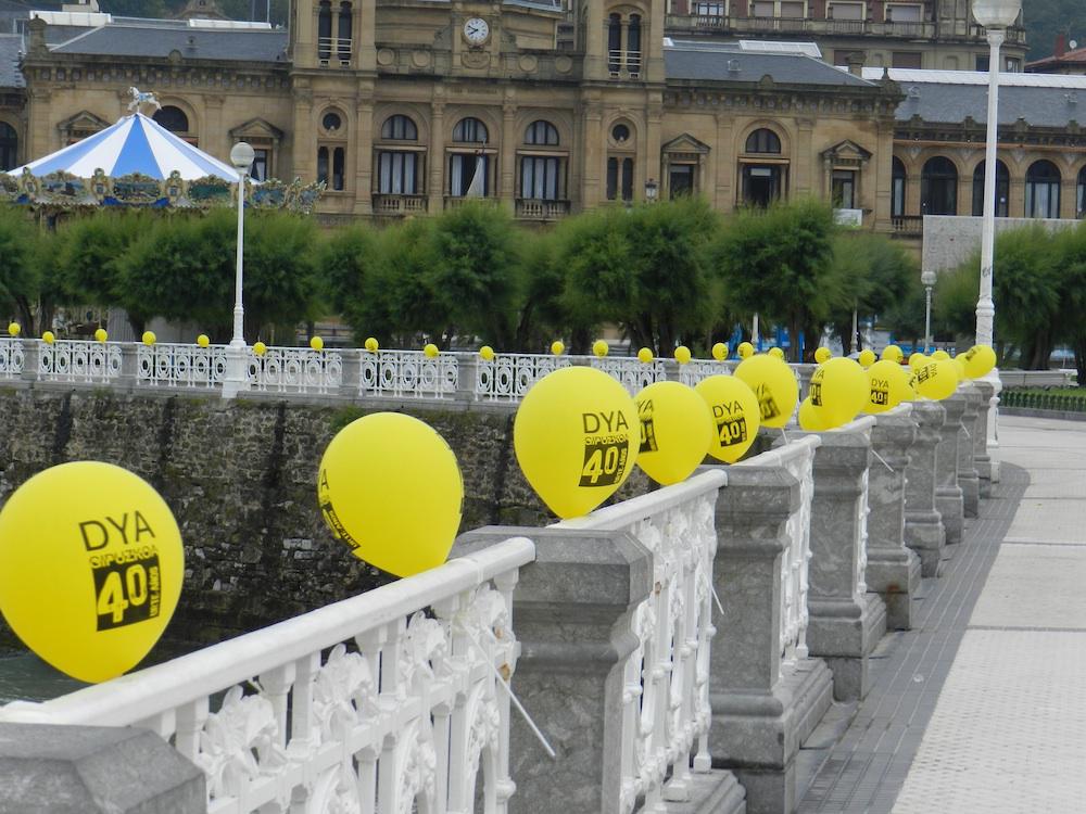 Goizean goizetik DYAren koloreko puxika horiz bete dituzte itsasbazterra eta Bulebarra, eta Aquarium parean ere ‘DYA 40 urte, eskerrik asko’ mezua zeraman zepelin erraldoia aireratu dute.