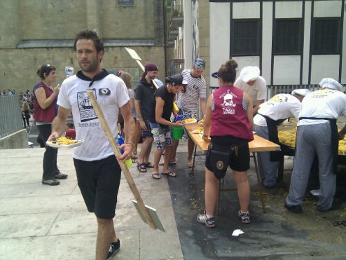 Piratek bazkari ederra prestatu dute Zuloaga plazan. Baltsak txukun-txukun loturik utzi dituzte kaian, eta arratsalderako indarberritu dira. Paella erraldoitik plater bana hartu dute, entsalada pixka bat, eta postrerako, txokolatezko kopa. Edariak ere ez du hutsik egin, eta sagardoarekin freskatu dituzte eztarriak.
