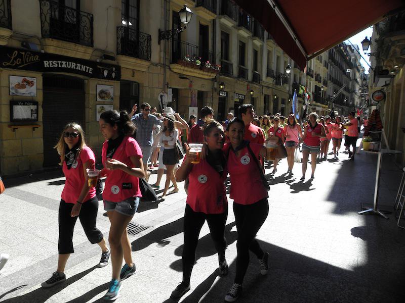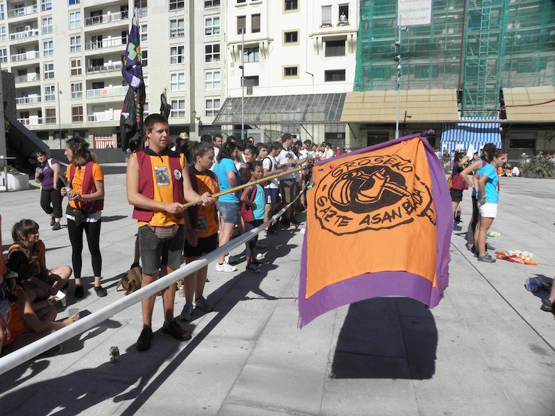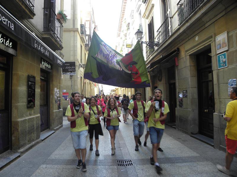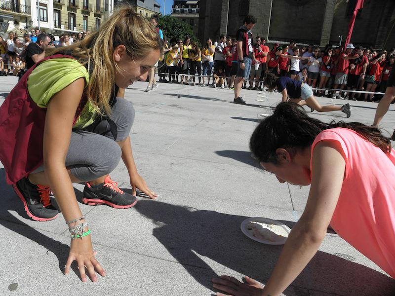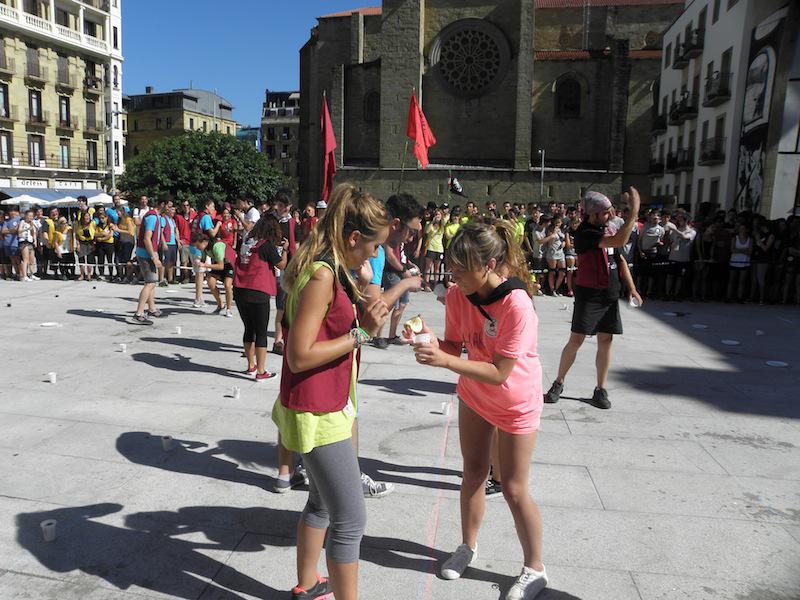 Koadrila bakoitza bere banderarekin bertaratu da La Flamenka gunera, batzuek euren auzotik kalejiran hurbildu eta gero. Giro bikaina sortu dute, lehia baino, helburua ondo pasatzea zela jakitun baitziren hasiera hasieratik. Kaitik Zuloaga plazara joan dira ondoren, Parte Zaharreko kaleak girotuz, eta behin plazan jolasei ekin diete. Probak ez dira nolanahikoak izan. Erreleboka, jangai desberdinak jan behar izan dituzte, esaterako. Tipula, limoia, ogi bustia… plater edo edalontzi batetik bestera ibili dira, azkarrena izateko erronkarekin. Taldekideen oihu eta txaloen artean lehiatu dira gazteak, eta festak arratsalde osoan izan du jarraipena.