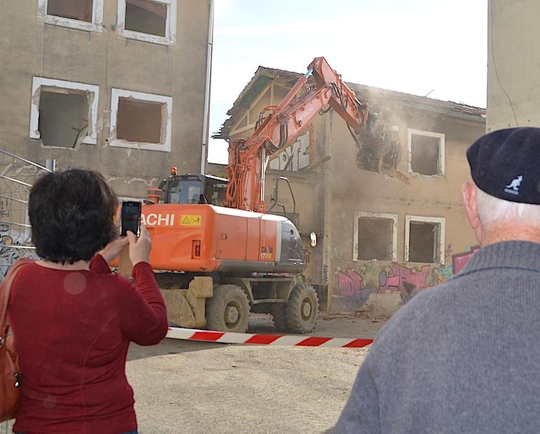 Aita Abarzuzan bota duten lehen eraikinaren hormak erraz erori dira. Begira zeuden bizilagunen oroitzapenak ez dira hain erraz birrinduko, ordea. Zurrumurru ugari entzuten zen makinaren zarataren azpitik. Margari Esparza anai-arrebekin etorri da, adibidez. Hautsitako leihoetatik, beren jaiotetxea izandakoaren ormak ikus zitezkeen. ‘Donosti Eder’ irakur daiteke oraindik atarian. Ederra izan da auzoa Esparzatarrentzat. Mila bitxikeria, oroitzapen eta umetako istorio ekarri dituzte gogora, atzealdean makina bat iragan hori apurtzen ari zela ohartu ere egin gabe.