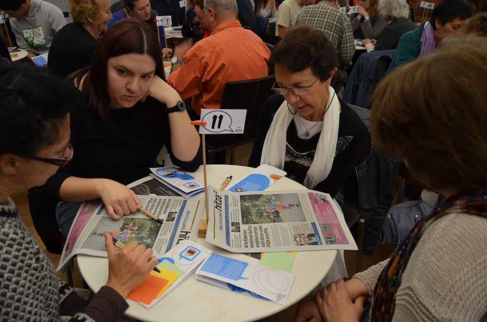 Hamabost minutu pasa direnean, gaia eta mahaiaz aldatu, eta beste pertsona batzuekin elkartu dira. Bigarren mintzagaia hedabideen eraldaketari buruzkoa izan da. Zein hedabide mota erabiltzen dituzu, eta zertarako? Galdera horiei erantzunez, bakoitzak bere iritziak eman ditu, eta euren ekarpenak paretan itsatsi dituzte.
