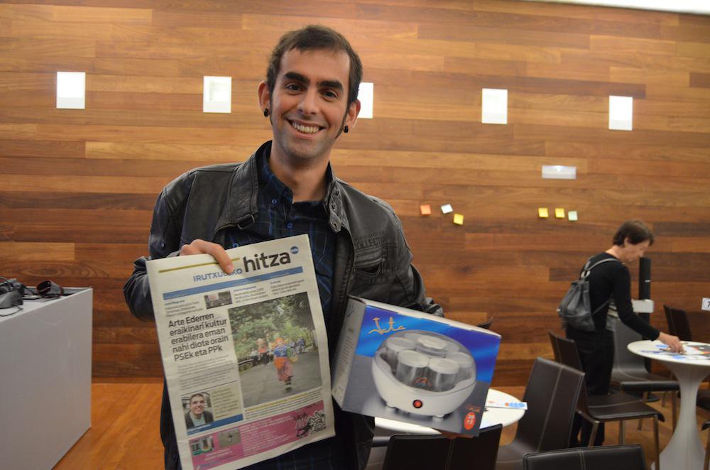 Txileko Jota Pizarro euskara ikaslea, Irutxuloko Hitzako alea eta jogurtontziarekin. (Argazkia: Lide Ferreira)