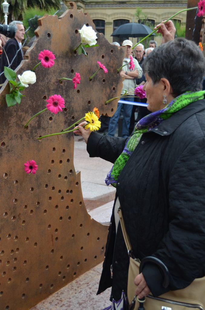Txistulariek lagunduta, udaletxetik Goikoa Jauregiaren aldamenera abiatu dira. Bertan, Izagirrek eta zenbait gonbidatuek fusilatutakoei omentzeko egin duten eskultura agerian utzi dute, eta senitartekoek lore-eskaintza egin diote.