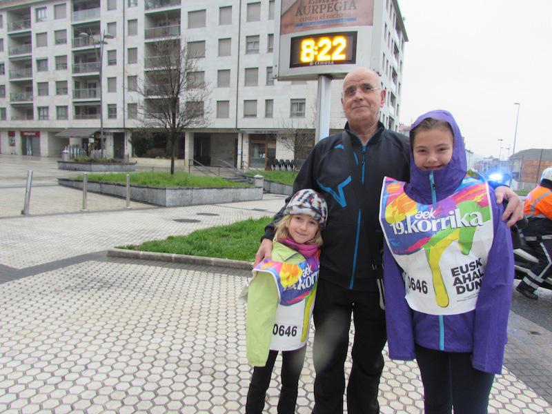 Bidebietako atetik sartu da Korrika 19 Donostian, 8:33an, hiriko kaleak lau orduz zeharkatzeko prest. Balentin Merino bidebietarrak erosi du Donostiako lehen kilometroa, baina berak nahiago izan du pankarta atzean korrika egin, bere biloba Isanek eta Marenek lekukoa har zezaten. Aiatik etorri da familia Merino bisitatzeko, eta berarekin batera Donostiako lehen metroak korrika egiteko. “Urteak damarazkit euskara ikasten euskaltegian, baina asko kostata ari naiz. Euskararekin ezin dudanez, nire ekarria egin nahi izan dut lekukoa erosita, ez baita lehen aldia”, adierazi du Merinok, bere bilobek lekukoa hartu baino minutu batzuk lehenago. Ziur bere emaztea gogoan izan duela; harek, bai, euskaraz egiten zuen etxean.