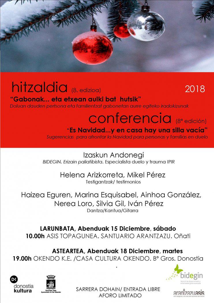 Gabonak… eta etxean aulki bat hutsik izeneko hitzaldian doluan dauden pertsonentzat eta familientzat Gabonei aurre egiteko iradokizunak egingo ditu Andonegik. Era berean, Helena Arizkorretak eta Mikel Perezek euren testigantzak azalduko dituzte, eta Haizea Eguren,ek Marina Esquisabelek, Ainhoa Gonzalezek, Nerea Lorok, Silvia Gilek eta Ivan Perezek dantza, kantua eta gitarra joko dituzte.