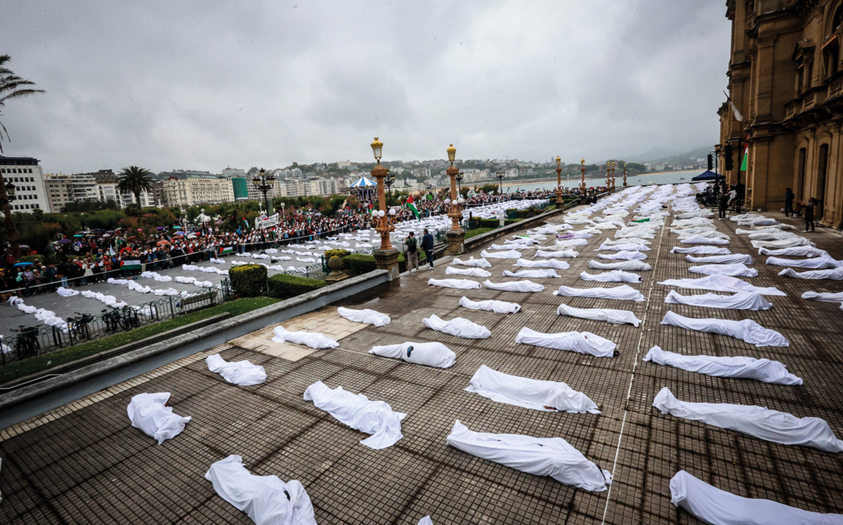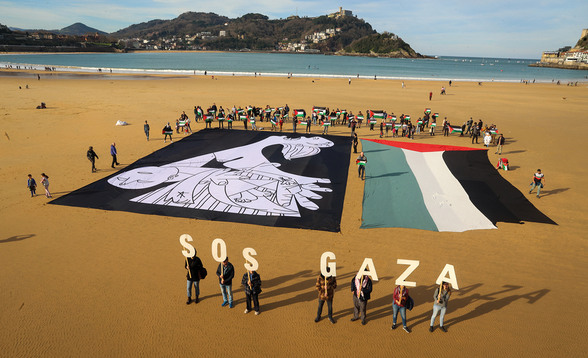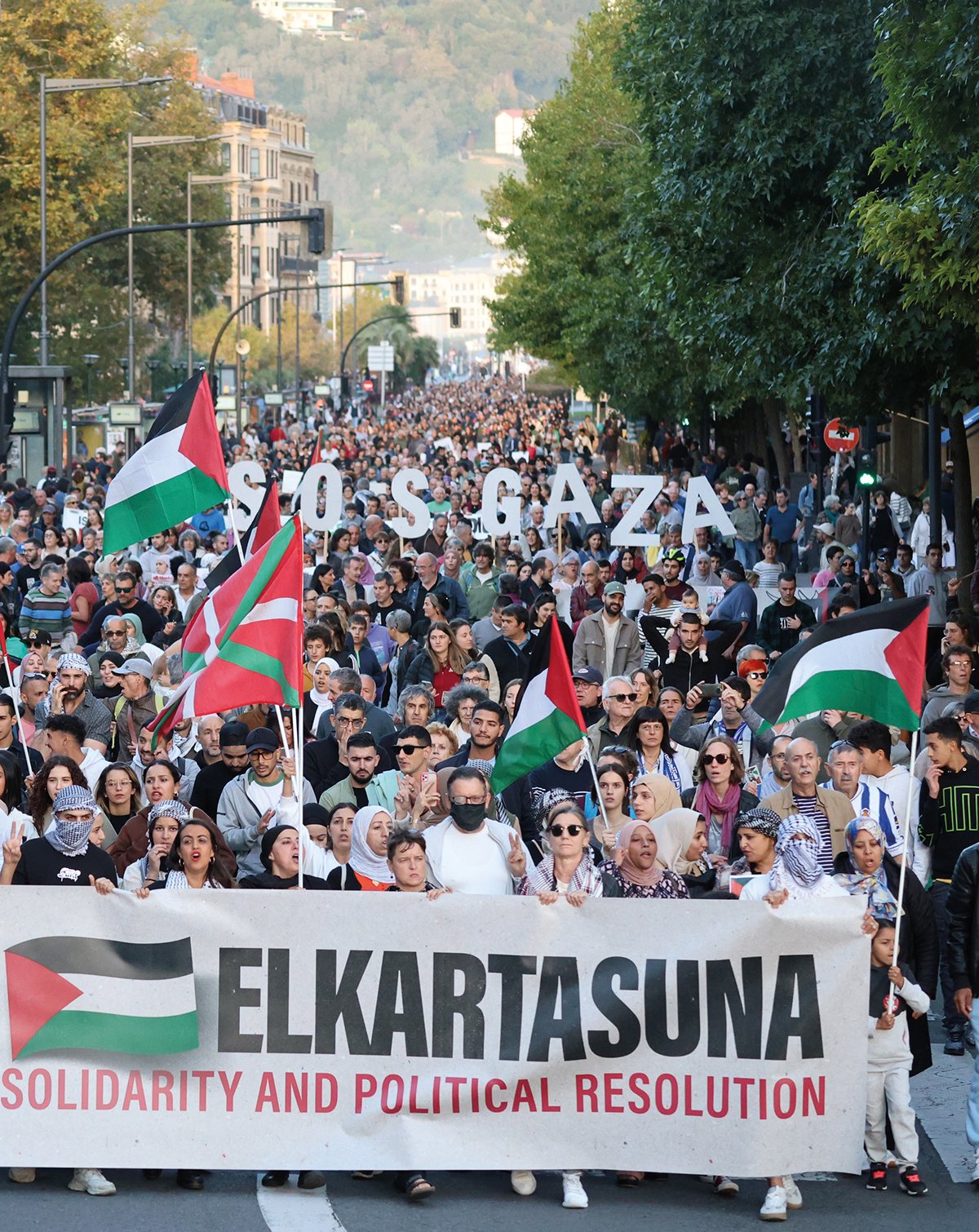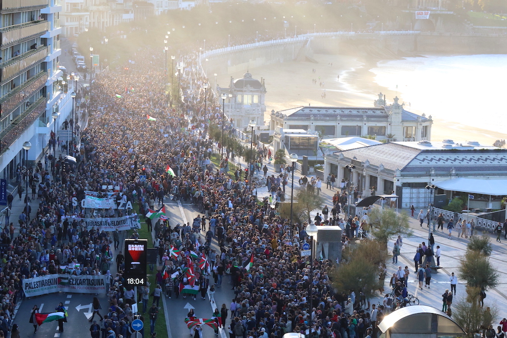 2023ko urriaren 7a: hainbat talde armatuk, tartean, Hamas erakunde islamistak, Israelen aurkako eraso handia abiatu zuten, 1.400 pertsona inguru hilez eta 250 inguru bahituz. Horren ondoren, hamarkada askotako jazarpen bortitza nabarmen areagotuz, Israelgo Estatu sionistak Palestinako herri guztiaren aurkako oldarraldia abiatu zuen, gaur gaurkoz gauzatzen jarraitzen duen genozidioa: 66.000 pertsona inguru hil ditu bi urteotan Israelgo armadak, datu ofizialen arabera. Nazioarteko estatu boteretsuenen pasibotasunaren aurrean, Palestinaren aldeko elkartasuna eta sionismoaren aurkako konpromisoa da herritarrei gelditzen zaiena, eta, bi urteotan, Donostia erreferente izan da horretan.