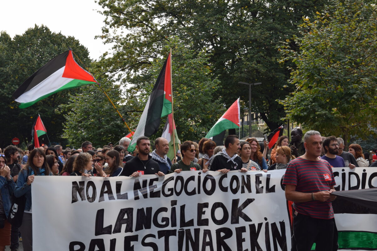 11:30ean abiatu da Amarako Pio XII plazatik Palestinaren aldeko lanuzte orokorragatik deituta zegoen zutabeetako bat. Jende andana batu da plazan, eta oihu bateratuan joan dira Bulebarreraino. Eason ere batu da jende asko, eta erdialdea zeharkatu dute, banderak gogotsu astinduz.
