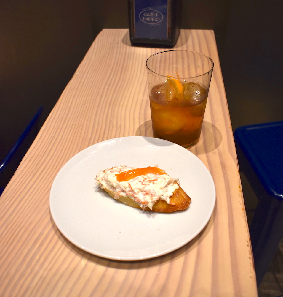 Gure Txoko oso taberna atsegina delako, pintxo oso goxoak ditu, prezio onean. Eta, bide batez, inguruan jendez eta, nagusiki, turistaz betetzen diren tabernen zonatik kanpo dagoelako. Auzoko betiko jendearekin topo egiten dut hemen.