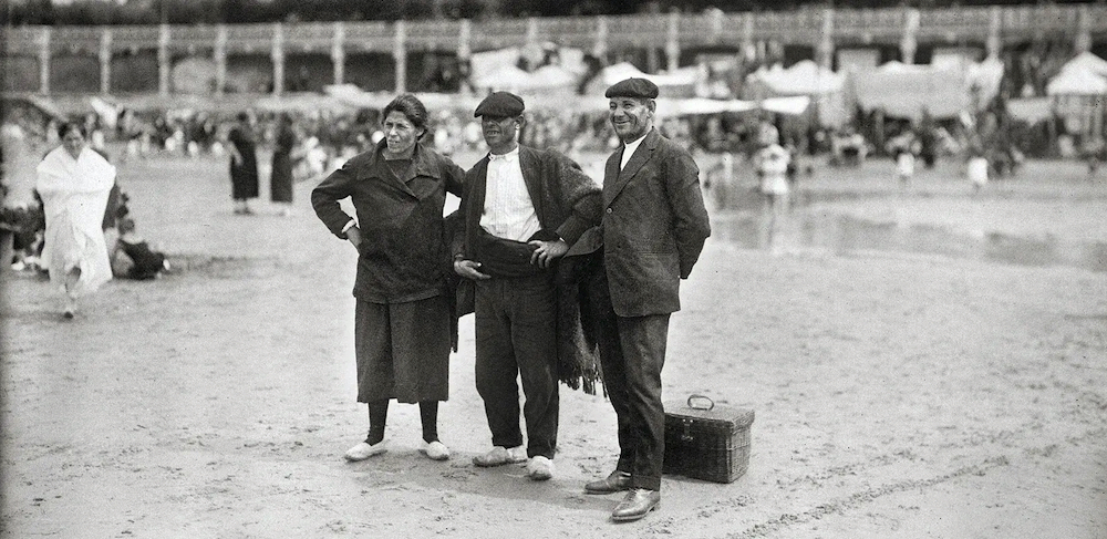 Donostiako hiru herritar, segur aski lehenengo aldiz hondartza zapaltzen, hondartzarekiko zaletasuna zabaltzen joan zen garaian. Argazkia 1925eko abuztukoa da.Ricardo Martin/Kutxateka