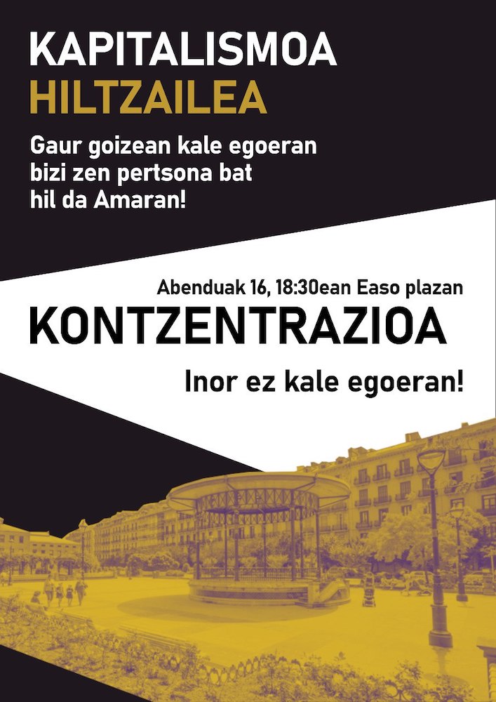 Ertzaintza eta anbulantzia bat bertaratu dira Easo plazara eta Ertzaintza ari da gertatutakoa ikertzen. Udaleko iturriek azaldu dute Ertzaintzak jakinarazi diela “heriotza naturala” izan dela, nahiz eta momentuz ez duten zehaztu zein izan den heriotzaren arrazoi zehatza. Donostiako hainbat gizarte eragilek gertakaria salatzeko elkarretaratzera deitu dute gaur arratsalderako (18:30) Easo plazan, Kapitalismoa hiltzailea lelopean.