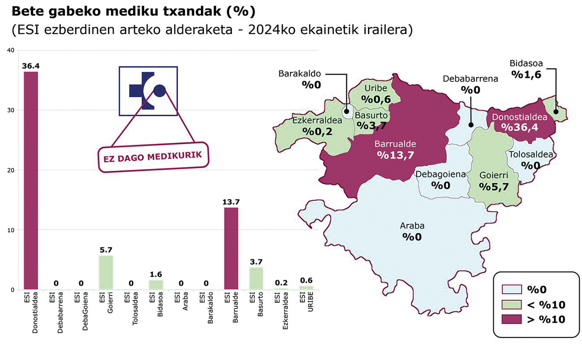 M.B.: Donostialdean dagoen zerbitzua okerrenetako bat da. Txanden %36ean medikurik gabekoak izan ziren 2024ean. Grebetan izan behar diren gutxieneko zerbitzuak ere ez dira betetzen! Arriskutsuena da normalizatzen ari garela zerbitzu batzuetan medikurik ez egotea. «Ospitalera joango naiz», dio jendeak. Ikaragarria da. Gauez erizainak bakarrik daude. Eromena da. Aste Santuan, Gabonetan, udaran… Gutxienez, bost hilabetetan minimoetatik behera. Hori ez bada egiturazkoa, hamabi hilabetetatik bostetan. Gainera, datuak lortzea oso zaila da: gardentasun eza eta opakotasuna ikaragarriak dira.