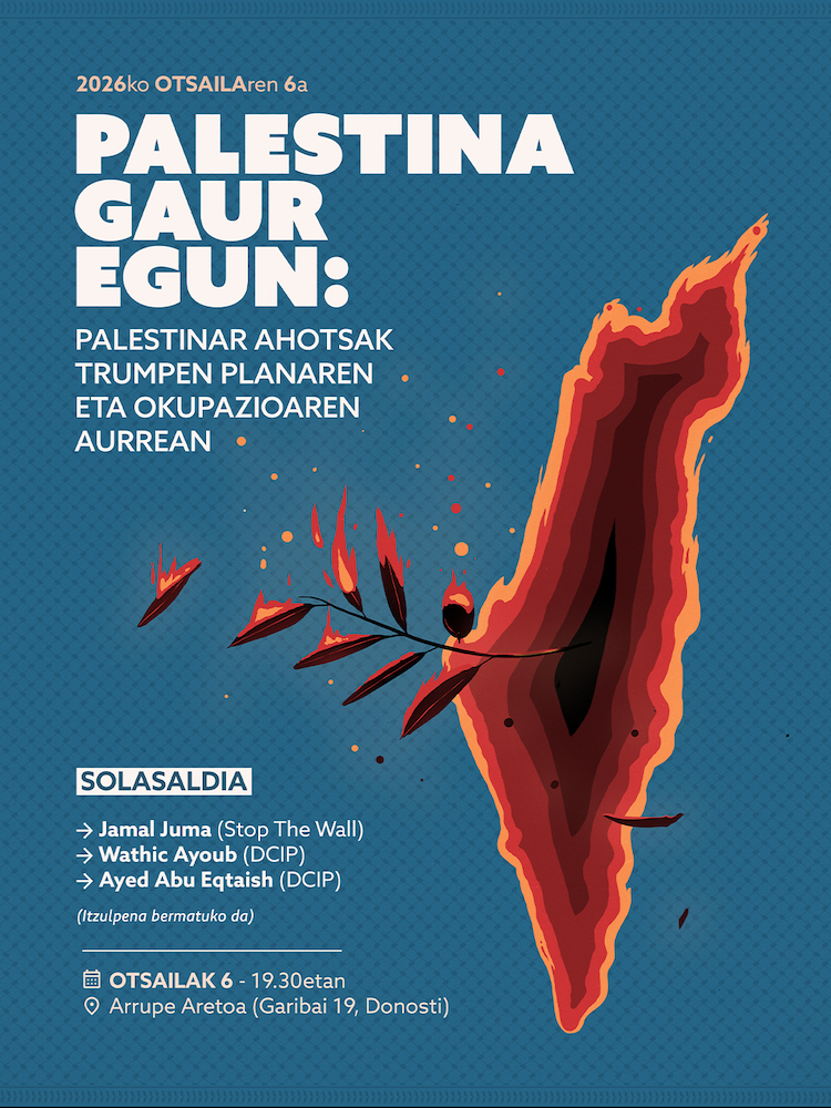 Palestinak egun bizi duen egoera izango dute hizpide, hiru hizlari palestinarren: Jamal Juma (Stop The Wall), Wathic Ayoub eta Ayed Abu Eqtash. Ayoub eta Eqtash DCIP Defense for Children International Palestine erakundeko kideak dira. “Haien bitartez, Palestinan bizi den errealitatea bertatik bertara ezagutzeko aukera izango da, AEBetako administrazioaren planen ondorioak eta Israelgo okupazioaren eragina aztertuz”, azaldu du BDZk.