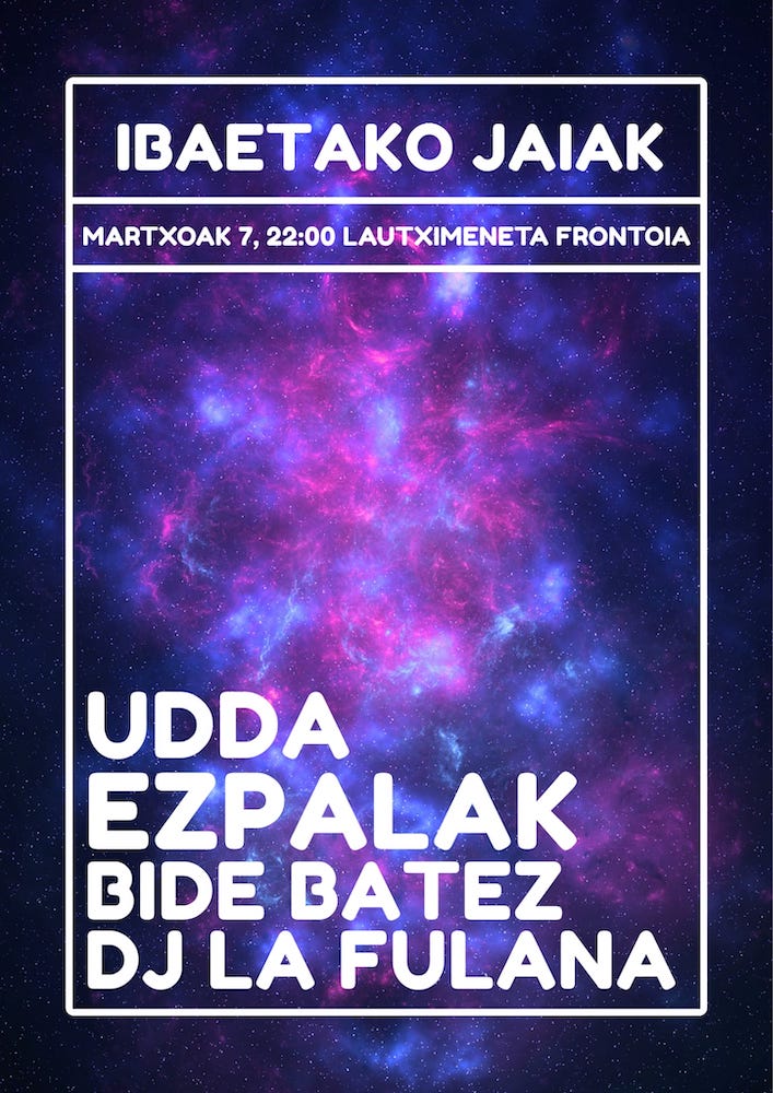 Ezpalak laukotea. Hiru talde eta musika jartzaile bat. Erritmo oneko menua prestatu dute Ibaetako jaietarako. Martxoaren 7an, Udda, Ezpalak eta Bide Batez taldeak ariko dira zuzenean, Lautximeneta frontoiak. 22:00etan hasiko dira emanaldiak. Ondoren, La Fulana musika jartzaileak girotuko du gaua goizaldera bitarte.