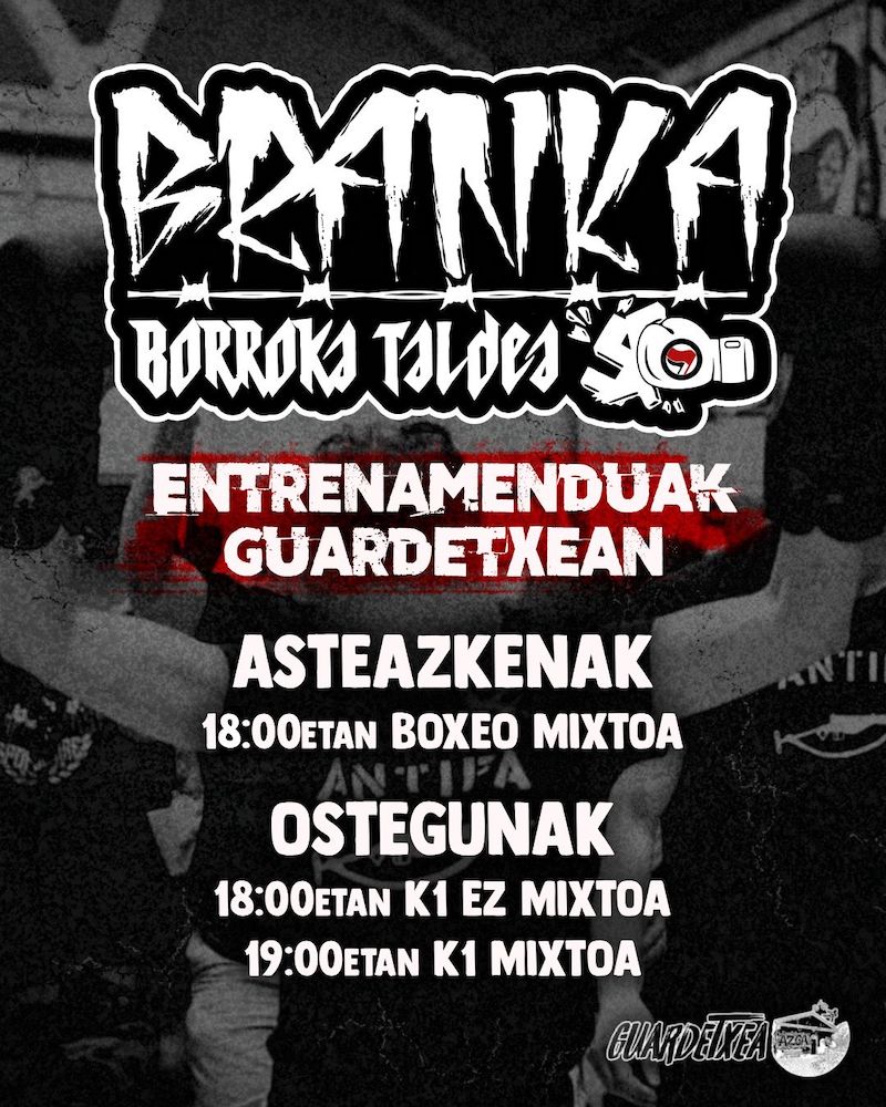 Horrela, astero, doako entrenamenduak antolatuko dituzte Guardetxean bertan: asteazkenetan, 18:00etan, boxeo mistoa eta, ostegunetan, 18:00etan, K1 ez mistoa eta, 19:00etan, K1 mistoa. Egitasmo irekia dela nabarmendu dute antolatzaileek: “Materialik izan ezean, lasai etorri probatzera, bertan utziko dizugu”.