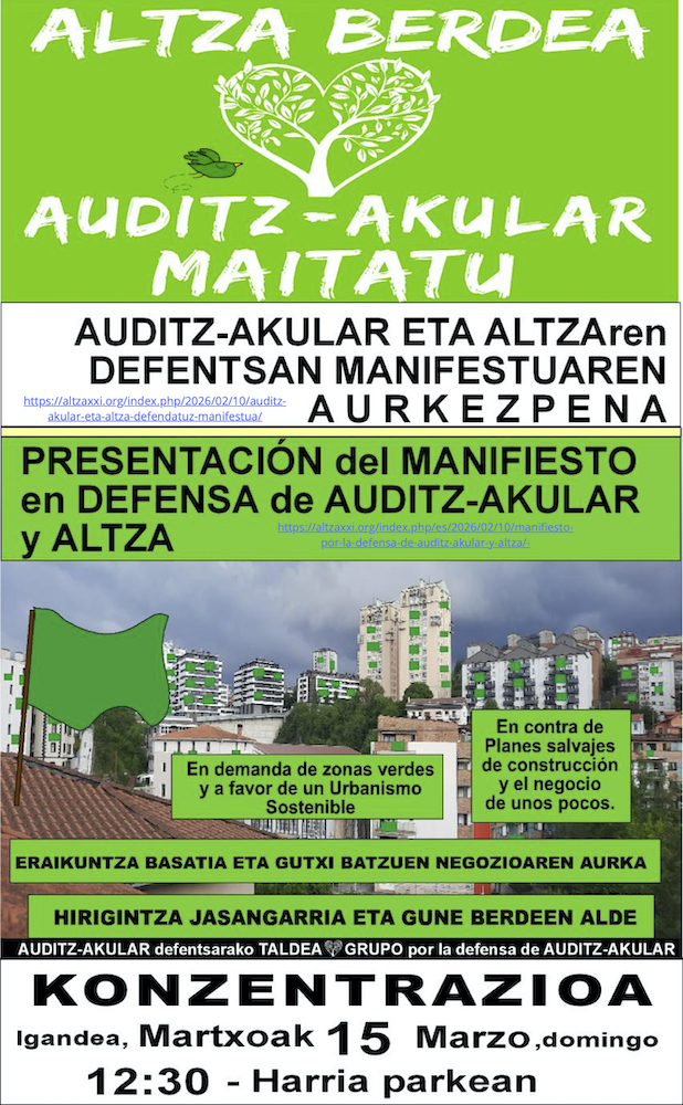 Bertan, Auditz Akular eta Altza defendatzeko manifestua aurkeztuko dute jendaurrean. Hain zuzen ere, gogoratu behar da Auditz Akularren 3.000 bat etxebizitza eraikitzeko asmoa duela Donostiako Udalak, eta horrek auzoa are gehiago “masifikatuko” duela eta egun Altzak dituen beharrei erantzuten ez diela iritzita, eremua babesteko “bost arrazoi” plazaratuko dituzte, manifestuaren bidez.