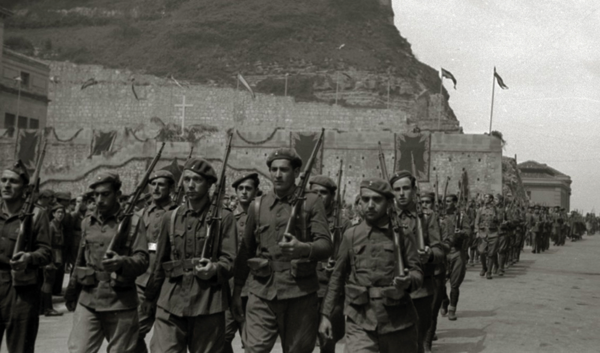 1937ko urrian egin zuten frankistek euren lehenengo ekitaldia, San Telmoko plazan.Pascual Marin/Kutxateka Espainiako Estatuko herrixka txikienetik hiririk handienera, erregimen frankistak bere esku zegoen guztia egin zuen memoria eta ideia errepublikanoak zapaltzeko eta faxismoa odolez inposatzeko, baita kale izendegiak goitik behera aldatu eta monumentuak altxatu ere. Donostia ez zen salbuespena izan, eta San Telmo plaza, egungo Zuloaga plaza, izan zen frankisten memoria gune nagusia, hamarkada luzez. Hala jaso zuen, Pedro Barruso Bares historialariak Memoria e historia de la Guerra Civil. Lugares de memoria en San Sebastián lanean.