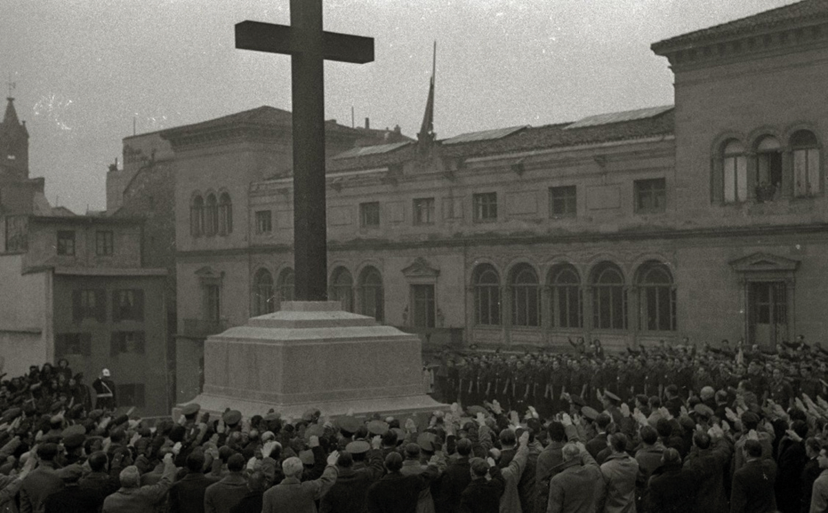 Jose Antonio Primo de Riveraren omenezko ekitaldi bat, plazako gurutze frankistan, 1942an.Vicente Martin/Kutxateka