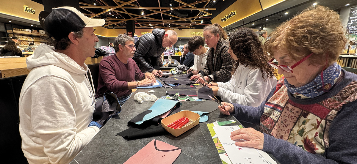 Hain zuzen ere, tailer solidarioak antolatzen ari dira ostiralero, erabiltzen ez diren neoprenoak produktu berri bihurtzeko. «Martxoko ostiral guztietan, erabiltzen ez diren neoprenoak diru zorrotan, nezeserretan edo zorroetan bihurtzen ari gara», azaldu du Ane Lopezek.