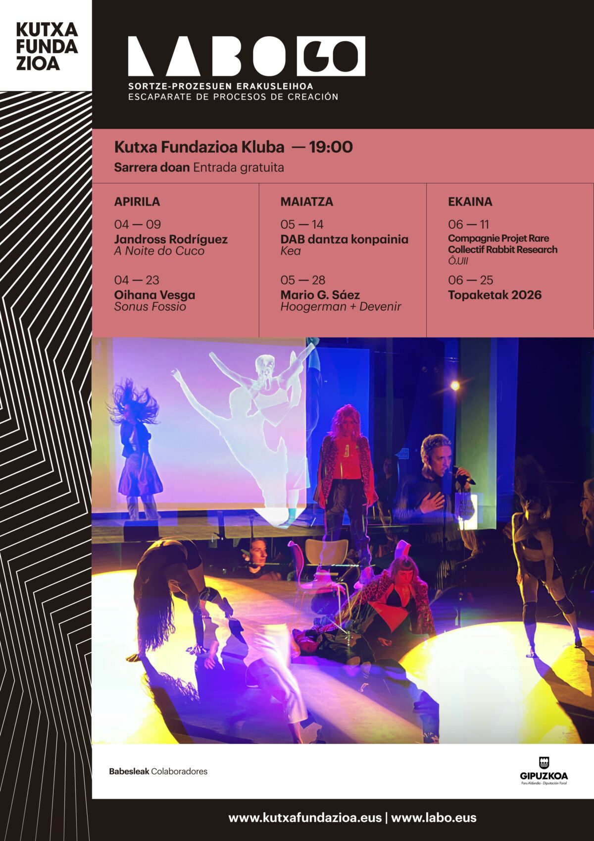 Apiriletik ekainera bitartean egingo dute LABO GO zikloa.LABO Apiriletik ekainera egingo dute aurtengo LABO GO zikloa, LABO programaren barruan, NODE dantza eta performance konpainiaren eskutik. Dantza, antzerki eta zirku garaikidearen proposamenak publikoarekin partekatzeko aukera eskaintzen du zikloak, eta ohiko legez, Tabakalerako Kutxa Fundazioa Kluba aretoan egingo dute.
