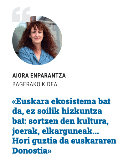 Enparantzak indarra egin du ideia batean: «Euskara komunitate gisa ikusi behar da. Euskara ekosistema bat da, ez soilik hizkuntza bat: sortzen den kultura, joerak, elkarguneak… Hori guztia da euskararen Donostia». Gaztelumendik ere norabide berean garatu du ideia: «Herri gisa zor diogu euskara ikasteko erraztasuna hona bizitzera datorren edonori. Hori ez da ardura indibidual bat. Herri gisa sistema bat eskaini behar dugu euskara doan, erraz eta eskuragarri jartzeko».