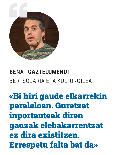 Gutxi balitz, euskaldunen existentziaz axolagabe dauden horien kexak segituan datoz, «pixka bat molestatzen hasten garenean». Kritikoa da egoera: «Konformista samarrak izan gara. Euskararen hiria garela diogu, baina oso hauskorra da hori. Pare bat belaunalditan ez bada egonkortzen, atzerakada nabarmen bat emango da».