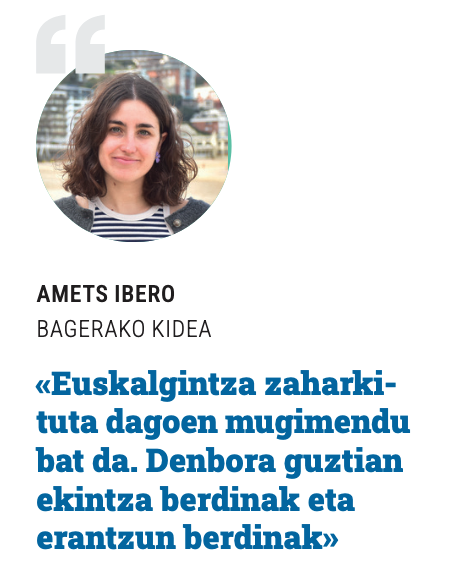 Iberok, berriz, euskalgintzaren dinamika bera jarri du mahai gainean. Haren ustez, mugimenduak berrikuntza behar du: «Denbora guztian ekintza berdinak eta erantzun berdinak errepikatzen baditugu, emaitza ez da aldatuko».