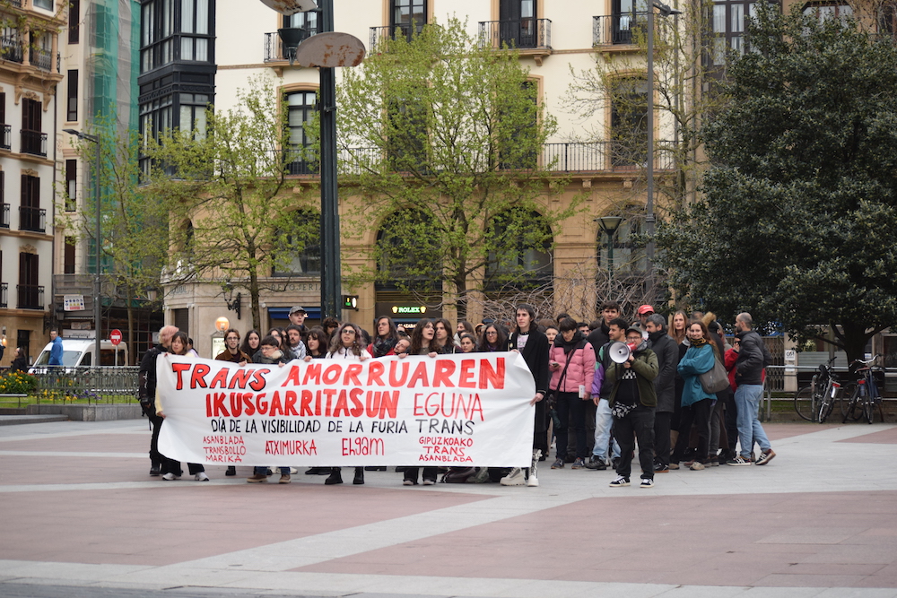 Trans ikusgarritasun eguneko elkarretaratzea. Nagore Garmendia Atzo arratsaldean hainbat lagun elkartu ziren Bulebarrean, trans kolektiboaren aurkako diskurtso eta erasoen aurrean “amorrua eta kezka” adierazteko. E28 koordindadorak –Ehgam, Gipuzkoako trans asanblada eta Transmarikabollo asanblada– eta Atximurka ikasleen kolektiboak antolatu zuten elkarretaratzea.