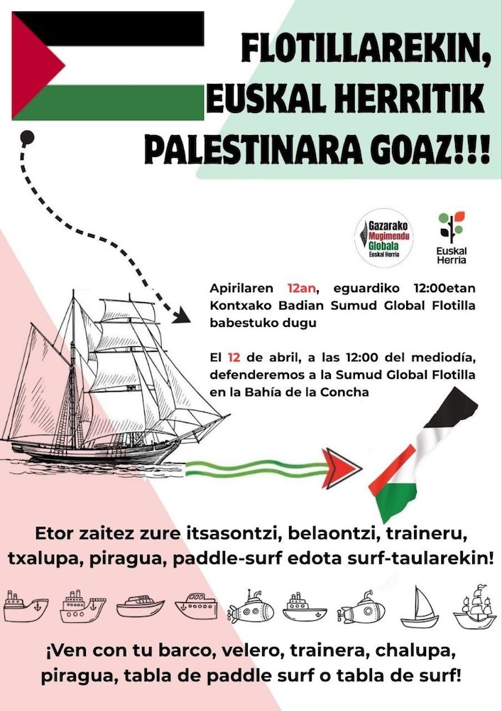 Hain zuzen ere, Gazarako Mugimendu Globala Euskal Herria plataformak herritarrak deitu ditu badiako uretan sartzera 12:00etan, “itsasontzi, belaontzi, traineru, txalupa, piragua, arraun surf edo surf taulekin”, Donostiatik Global Sumud Flotillari babesa adierazteko.