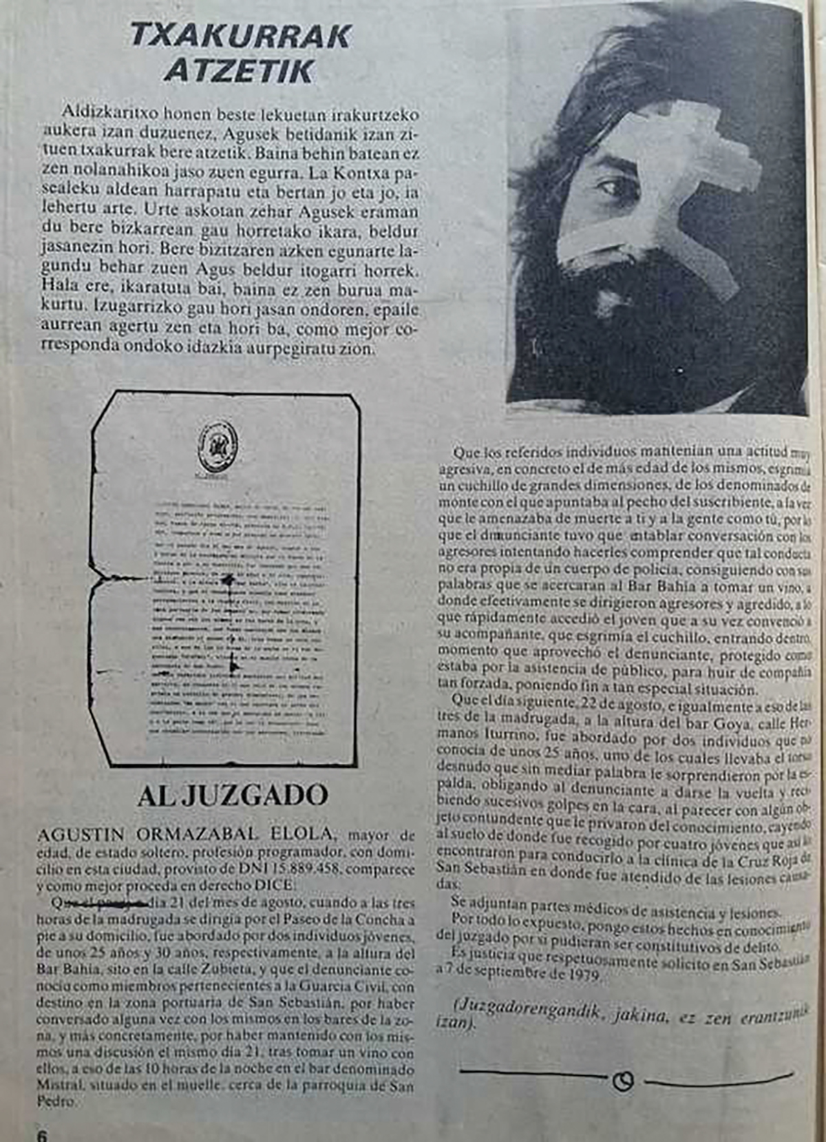 Gertakari lazgarri bat izan zuen Ormazabalek, bere bizitza eta heriotza osorik markatuko zituena. 1979ko irailaren 7an jarri zuen salaketa, gertakariak abuztuaren 22koak izan ziren arren. Itxuraz, bezperan, 21:00ak aldera, Zubieta kalean bi guardia zibil joan zitzaizkion, oihuka eta mehatxuka, eskuan labana bat zutela. Bahia tabernara sarrarazi zituen Ormazabalek, eta orduan egin zuen ihes, bertakoen laguntzaz.