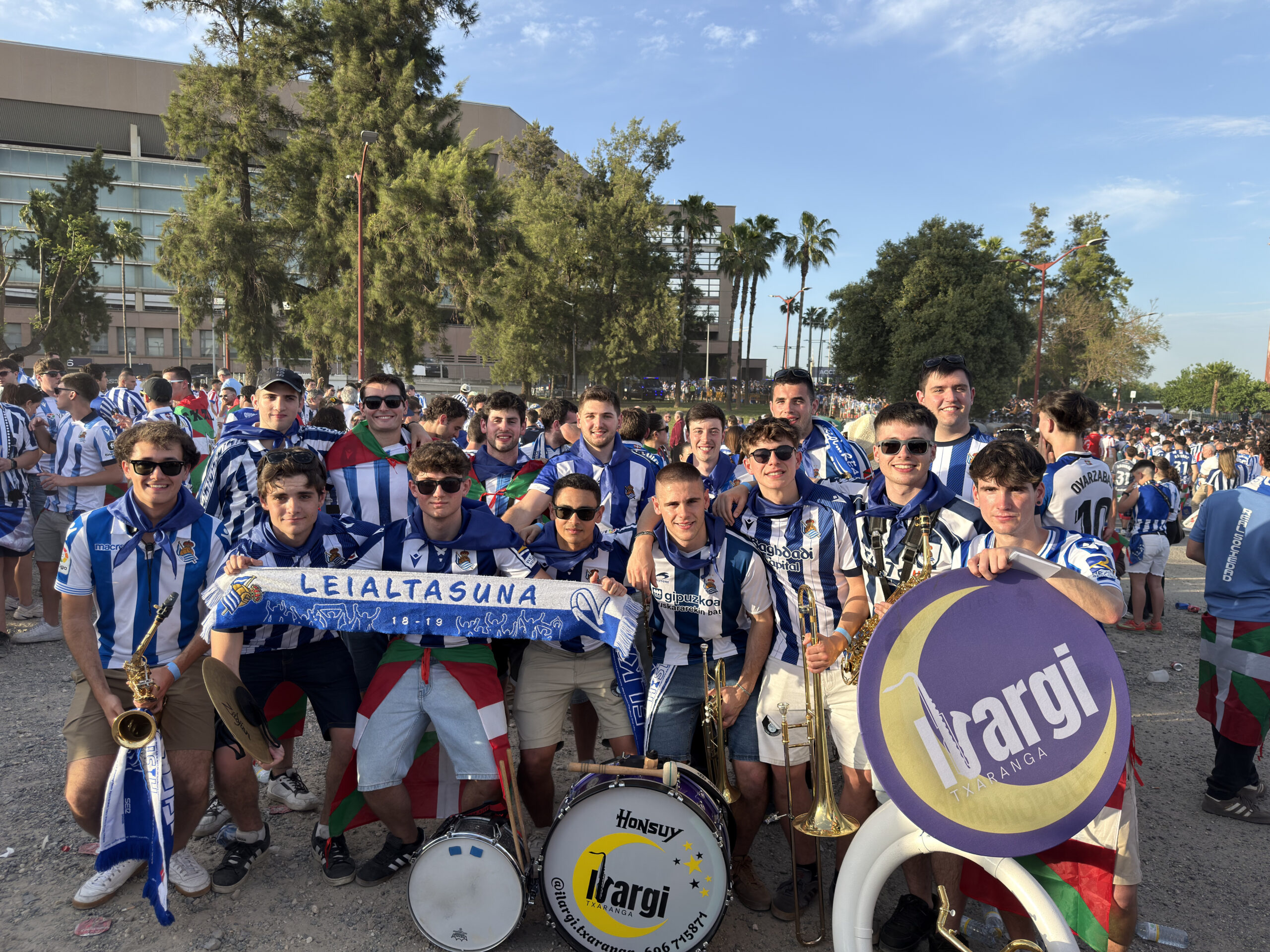 Sevillako Realaren 'fan zonetik' La Cartuja estadiora kalejiran irten ziren Ilargi txarangakoak larunbatean, milaka realzaleren konpainian. Taldeko Oier Mikeok xehetasun guztiak eman dizkigu.